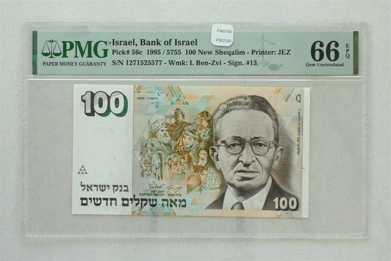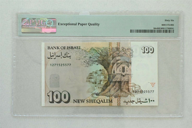 Israel 1995 /5755 100 New Sheqalim PMG Gem UNC 66EPQ Bank of Israel. Pick # 56c Wmk: I Ben Zvi PM0190 combine shipping