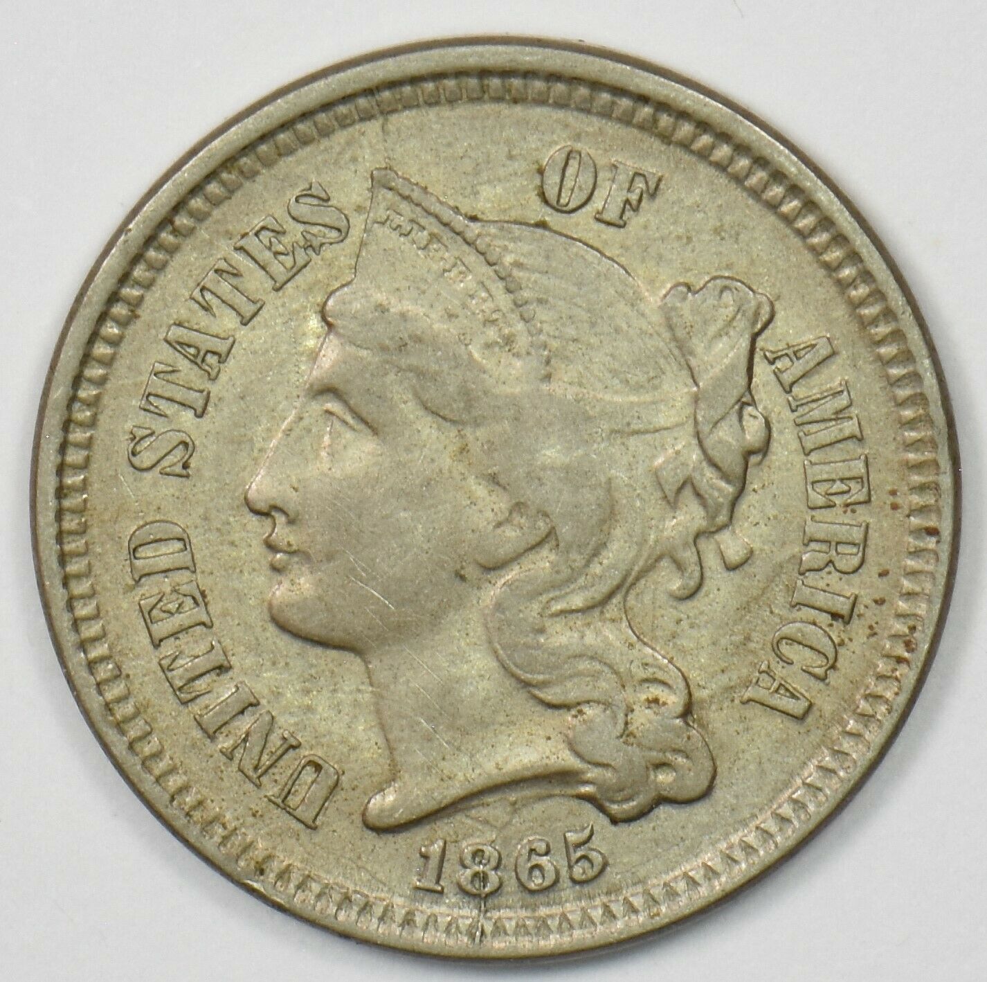 1865 Three Cents 3c Nickel XF-AU+ U0376