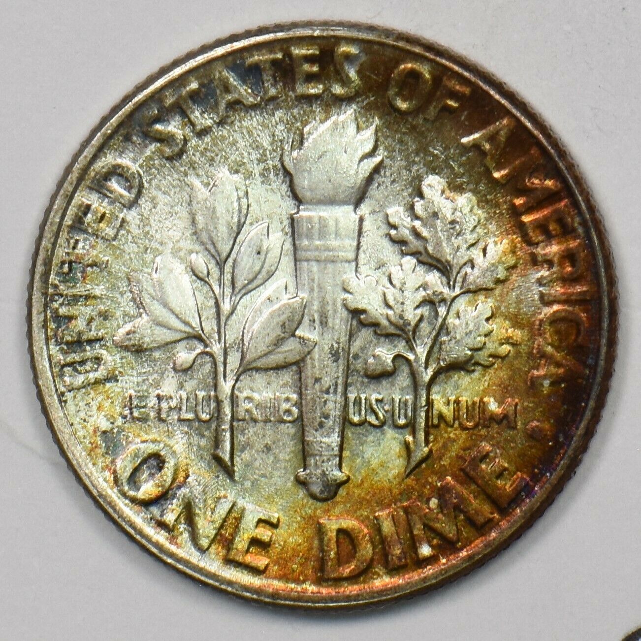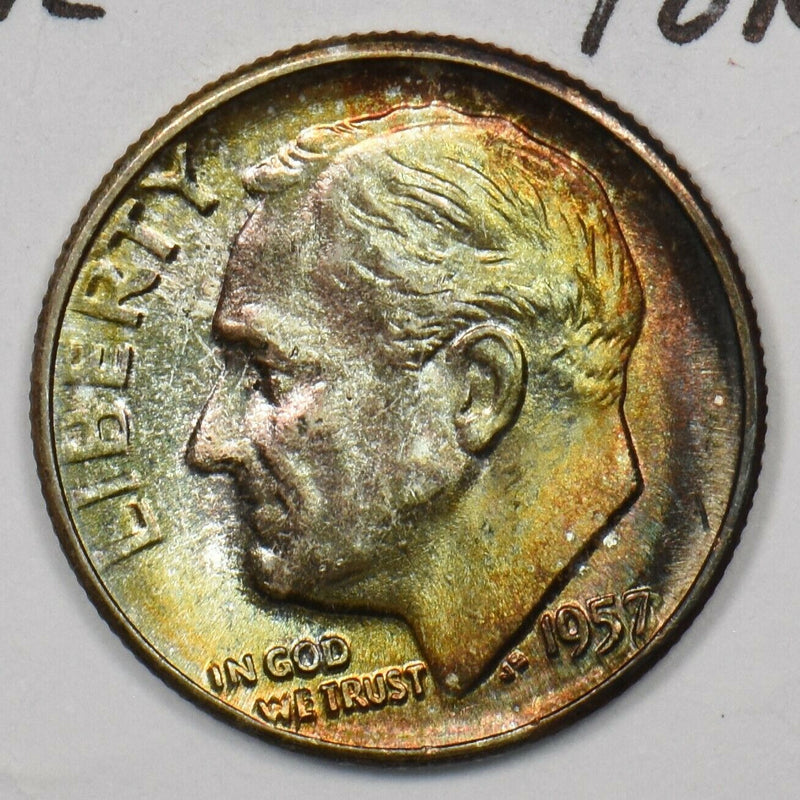 1957 Roosevelt Dime 90% silver Rainbow toning Gem BU U0277