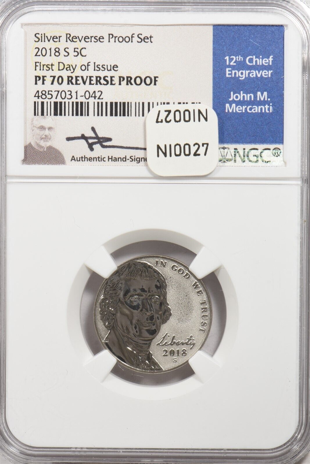 2018-S Silver 5 Cents Reverse First Day Issue Mercanti Signed NGC Proof 70 NI002