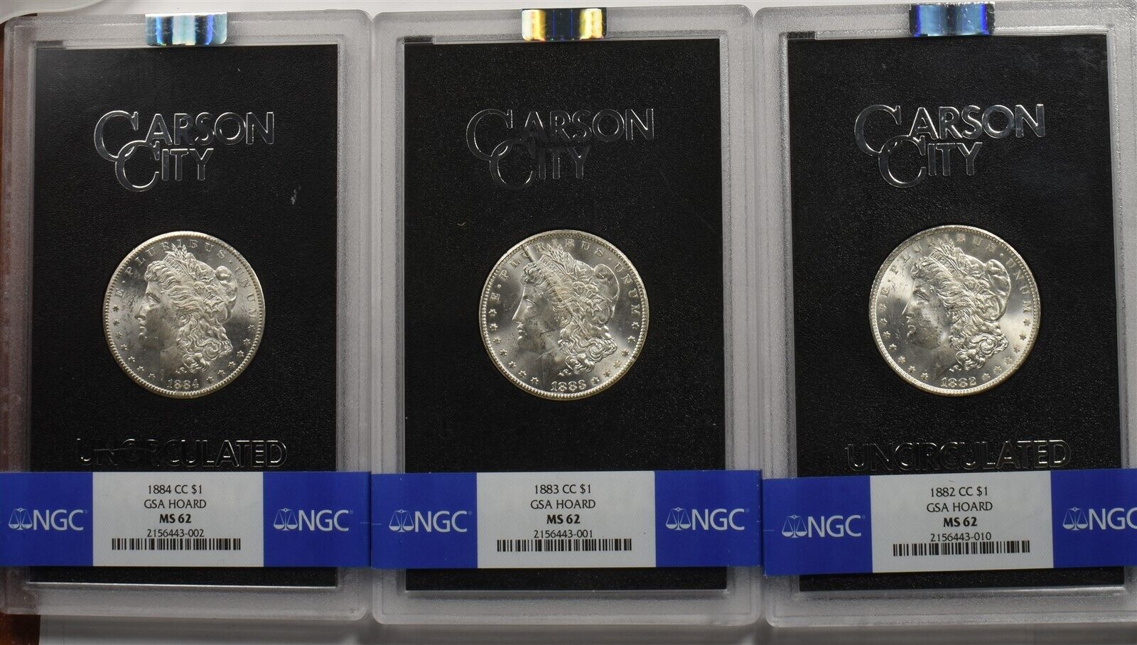 US 1882/1883/1884 CC GSA Holder Silver Morgan Dollar NGC MS62 Lot BL0239