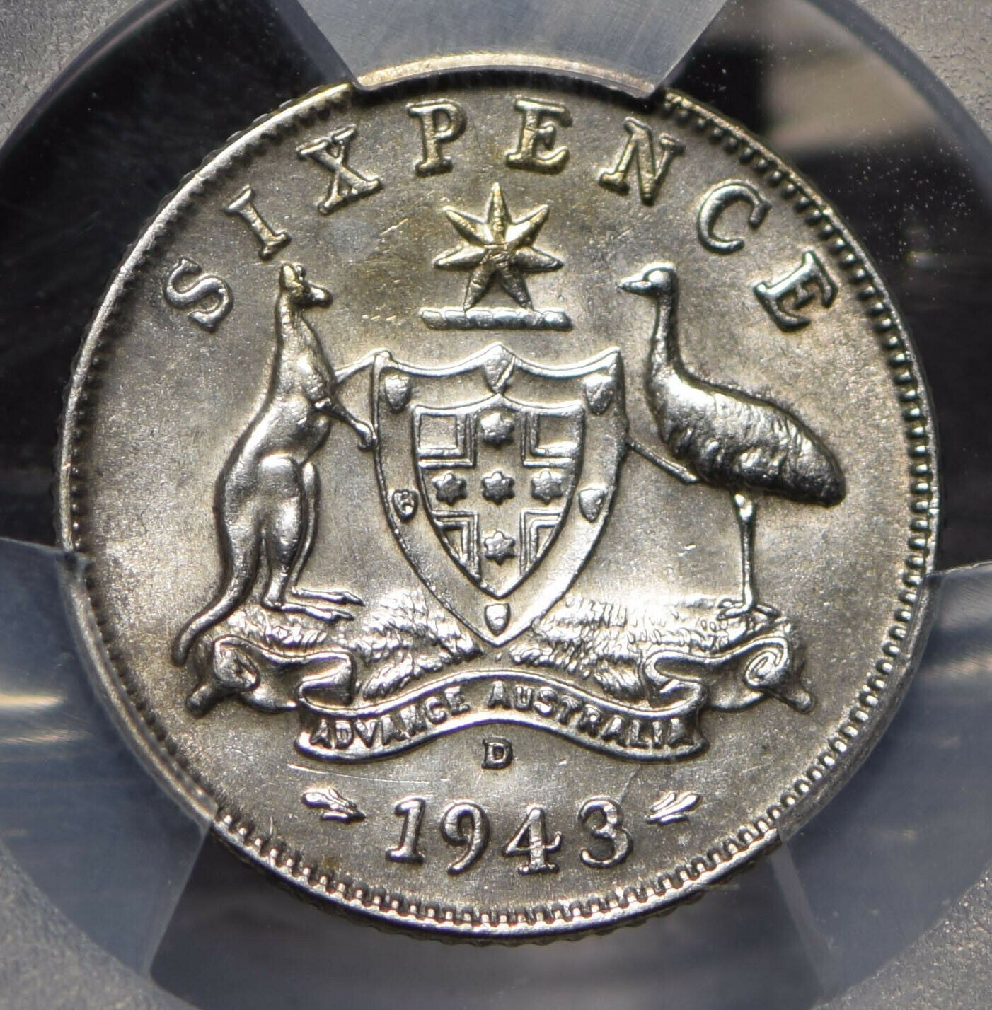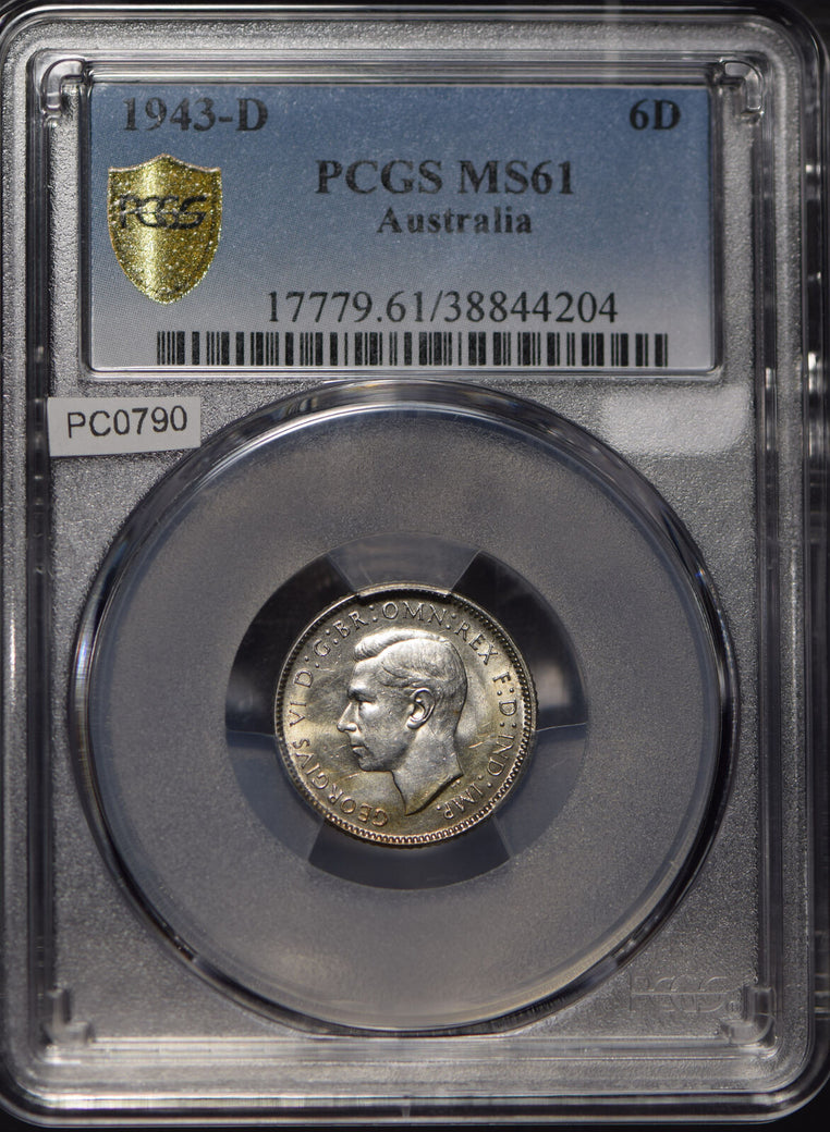 Australia 1943 6 Pence Kangaroo animal Emu PCGS MS61 PC0790* combine shippingMutiples in stock, the one you receieve will be of the same grade but cert number may vary