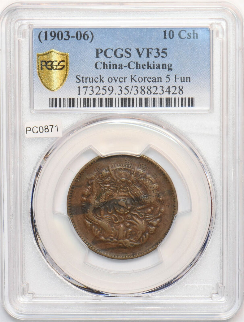 China 1903 ~06 10 Cash PCGS VF35 Chekiang. Struck over Korean 5 Fun super rare PC0871 combine shipping
