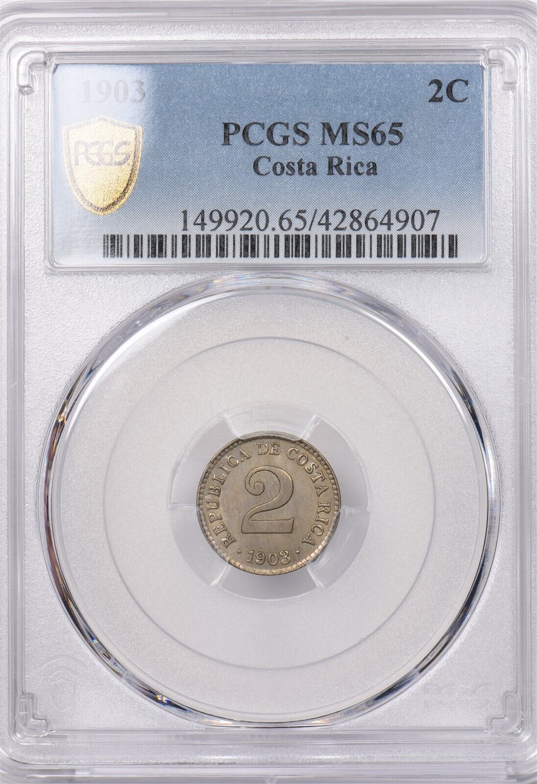 Costa Rica 1903 2 Centimos PCGS MS 65 finest known, None Finer PC1322 combine shipping