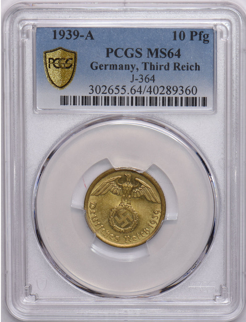 Germany 1939 A 10 Pfennig Eagle animal PCGS MS64 Third Reich. J-364 PC1086 combine shipping