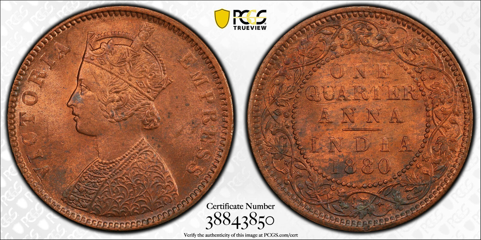 India British 1880 C 1/4 Anna PCGS MS64RB SW-6.494 Incuse C PC0898* combine shippingThe one you receive will be exactly as imaged