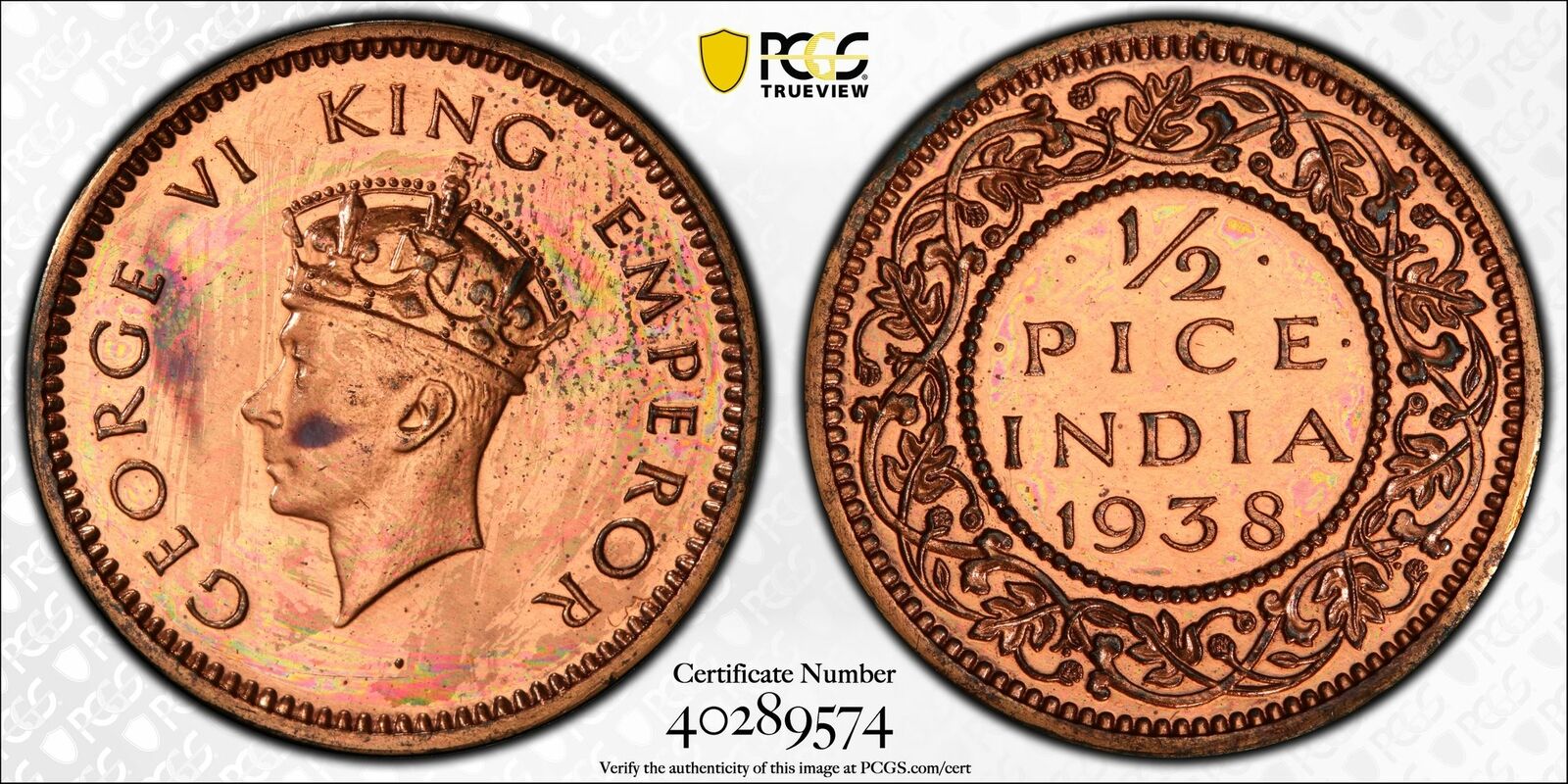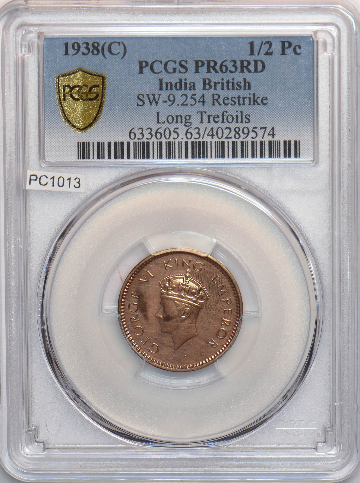 India British 1938 C 1/2 Pice PCGS PR63RD Restrike Proof SW-9.254 PC1013 combine shipping