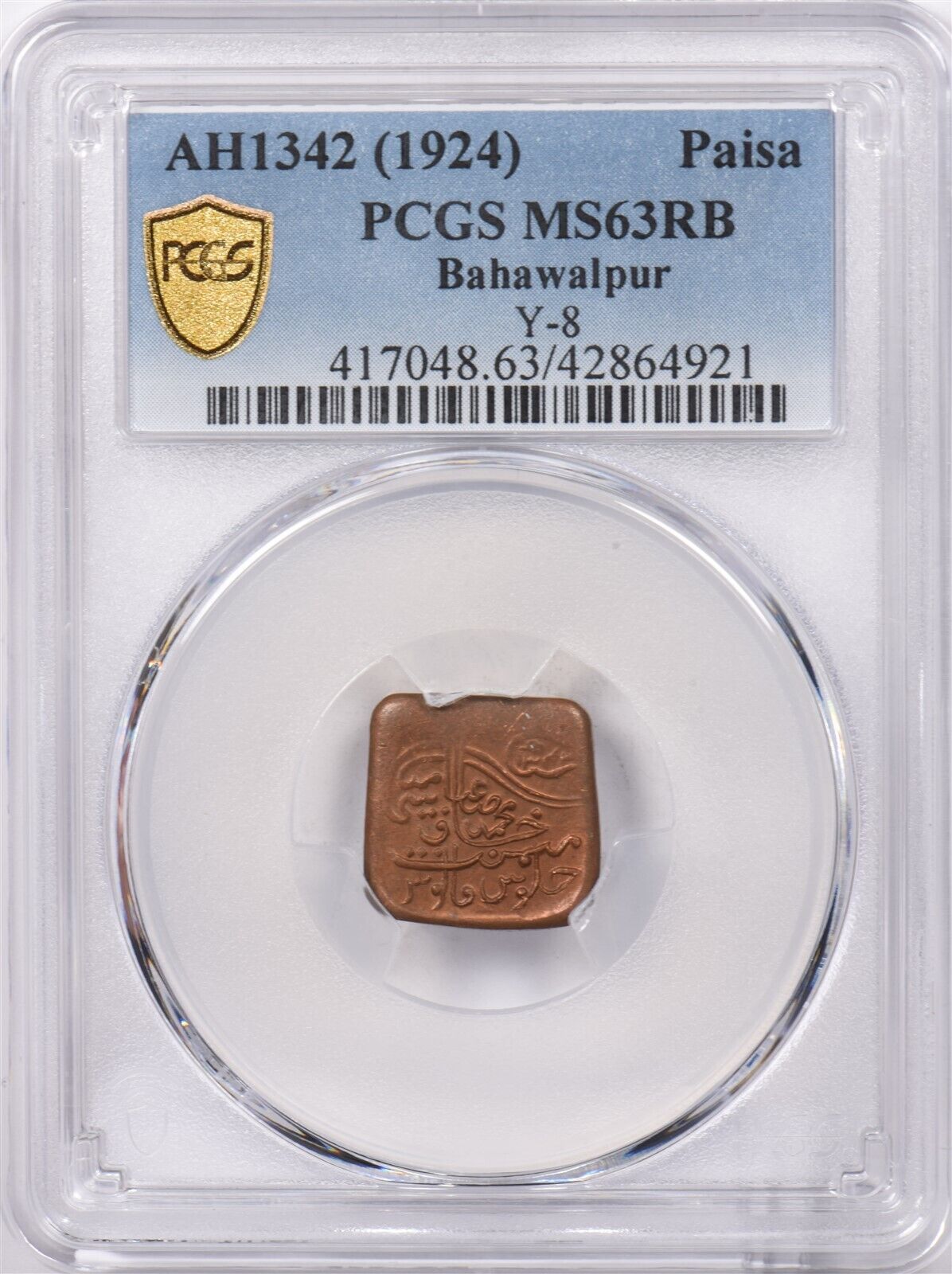 India Princely States 1924 AH 1342 Paisa PCGS MS 63 RED BROWN Bahawalpur Y-8, PI0179 combine shipping