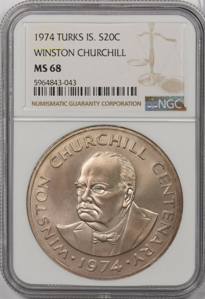 Turks and Caicos Islands 1974 20 Crowns silver NGC MS68 Winston churchill NG1309