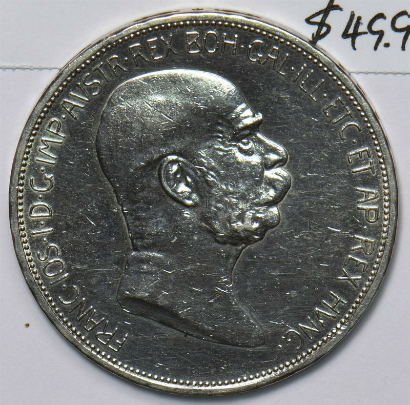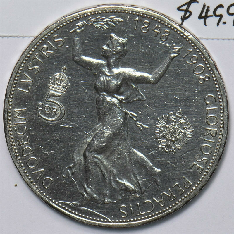 Austria 1908 5 Corona 60th year of reign cleaned 490776 combine shipping