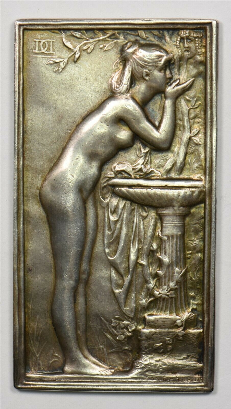 France 1908 UNC Art Nouveau. Silver plaque. Stands nude maiden drnking water from fountain/ ? On root. 35mmx65mm. Daniel Dupuis BU0713 combine shipping